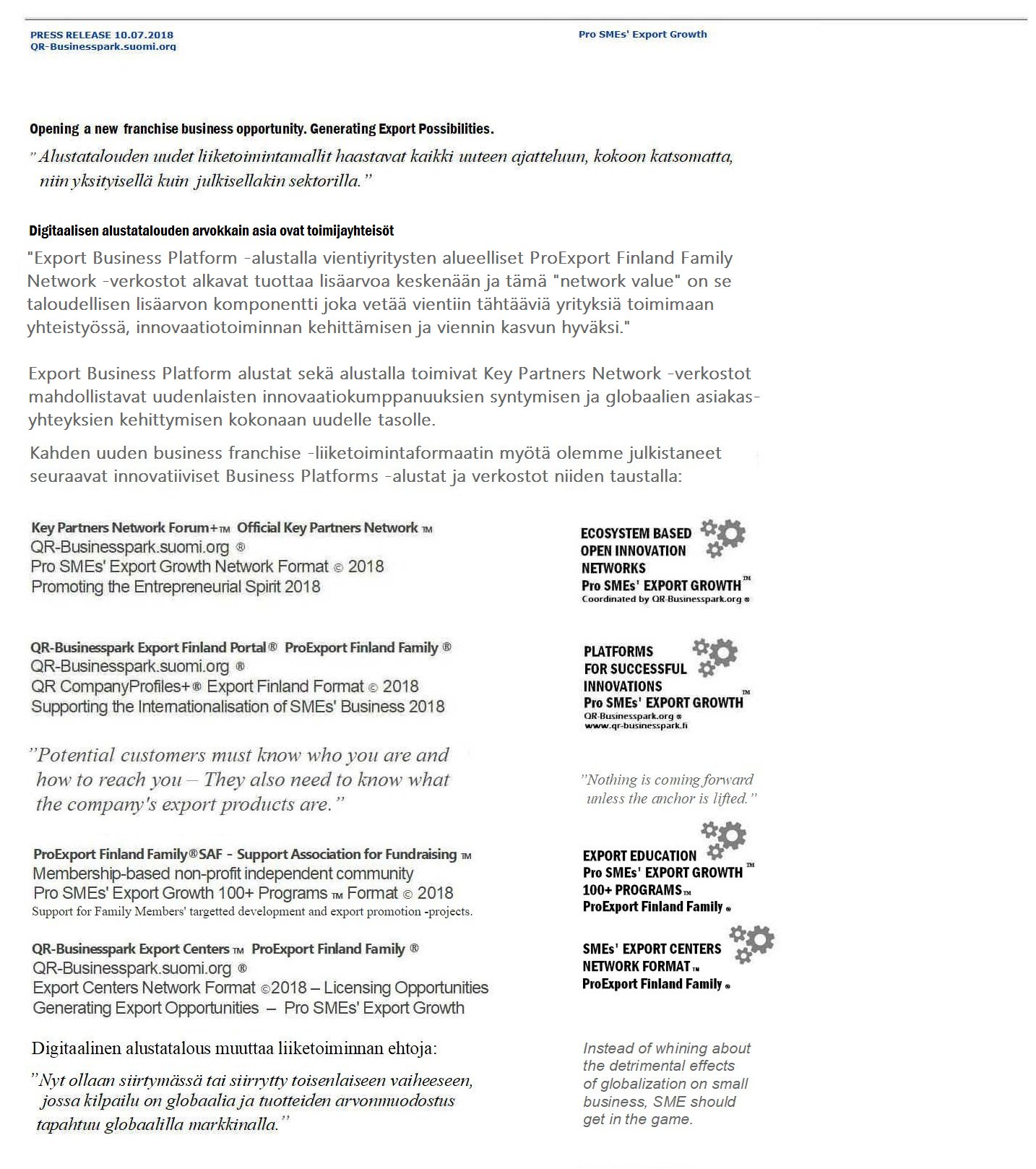 Could your company benefit from a new business model? Business model innovation can also help companies stay ahead in the product innovation game. Kustannustehokas keino Pk-yritysten viennin kasvun vauhdittamiseksi. "Vaikka vientimme veturit ovat taas iskussa, Pk-yritykset kaipaavat myös yritysten verkottumisen ja yritysyhteistyön kehittämistä. Samoin kansainvälistymisen johtaminen sekä myynti- ja markkinointiosaaminen vaativat kehittämistä." - Lue koko artikkeli Analyytikkojemme mukaan C21 -kaupunkiseutujen ja Kauppakamarin Allianssi Business Franchise -liiketoimintaformaattiemme mukaisen palvelun avaamisen vauhdittamisessa, toisi tervettä pöhinää Pk-yritysten Innovaatiotoimintaan, lisäisi yritys -yhteistyötä, ja boostaisi uutta vauhtia pk-yritysten vientimarkkinointikoulutukselle ja vauhdittaisi yritysten kansainvälistymistä ja viennin kasvua. Pk-yritykset ovat odottaneet kustannustehokasta keinoa kokeilla siipiään kansainvälisillä markkinoilla. Noin 3000 - 5000 vientiin tähyävää yritystä olisi valmiit kansainvälistymään. Analyytikkojemme mielestä tähän haasteeseen tulisi tarttua. QR-Businesspark.suomi.org ® - Service Development Team Expanding possibilities to do business in the global and connected world. For further information, please contact: Service Development Team email: qr.businesspark.suomi(at)gmail.com ProExport Finland Family ® Membership is the part of SMEs' Innovation strategy. Ecosystem based business network is the growth engine of the SMEs future export growth and the way to global |